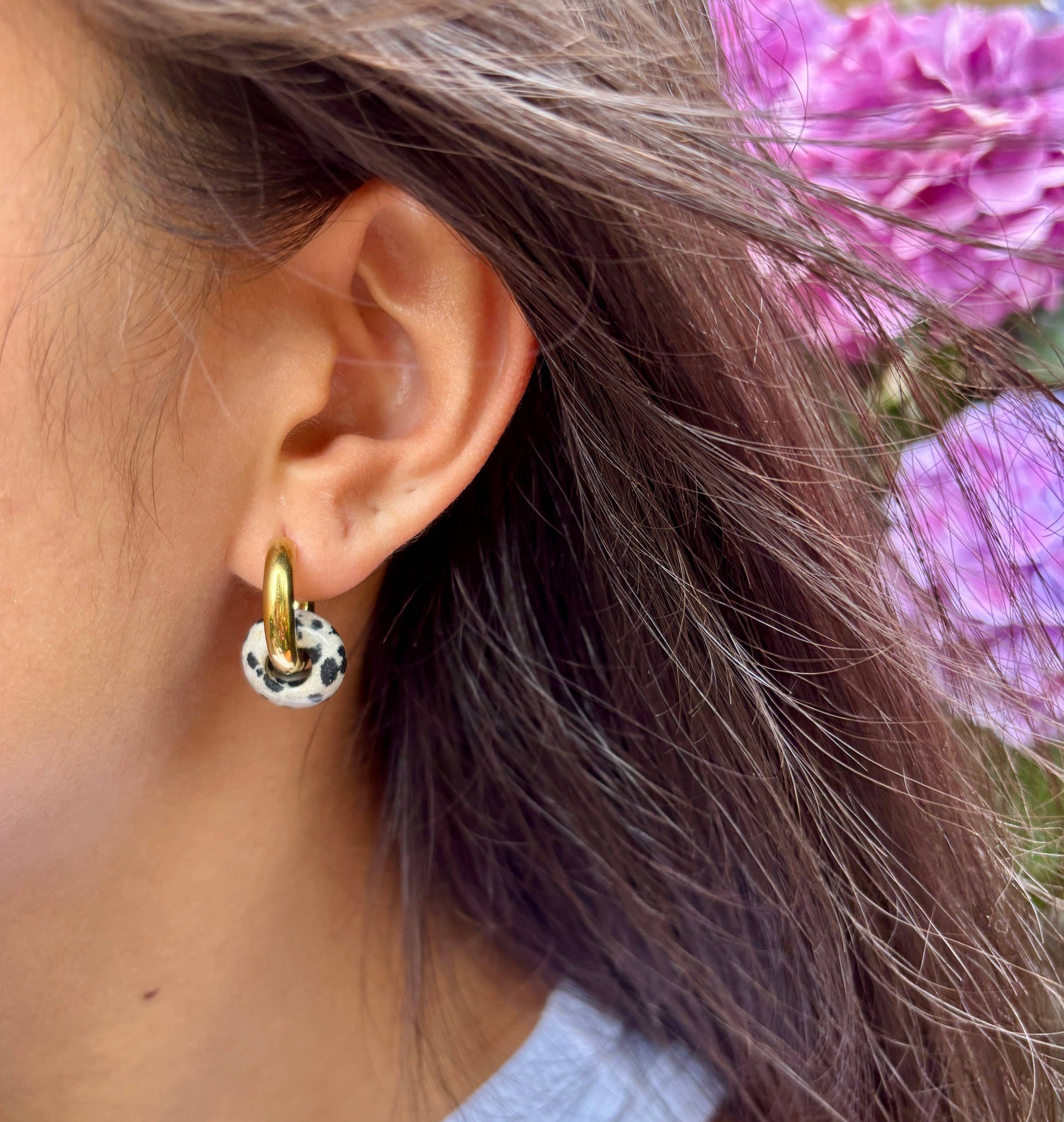 A new addition to our beloved donut family. This chunky 18ct gold plated hoop features a hanging Dalmatian Jasper doughnut charm. Bold, beautiful and sure to be as popular as the rest.