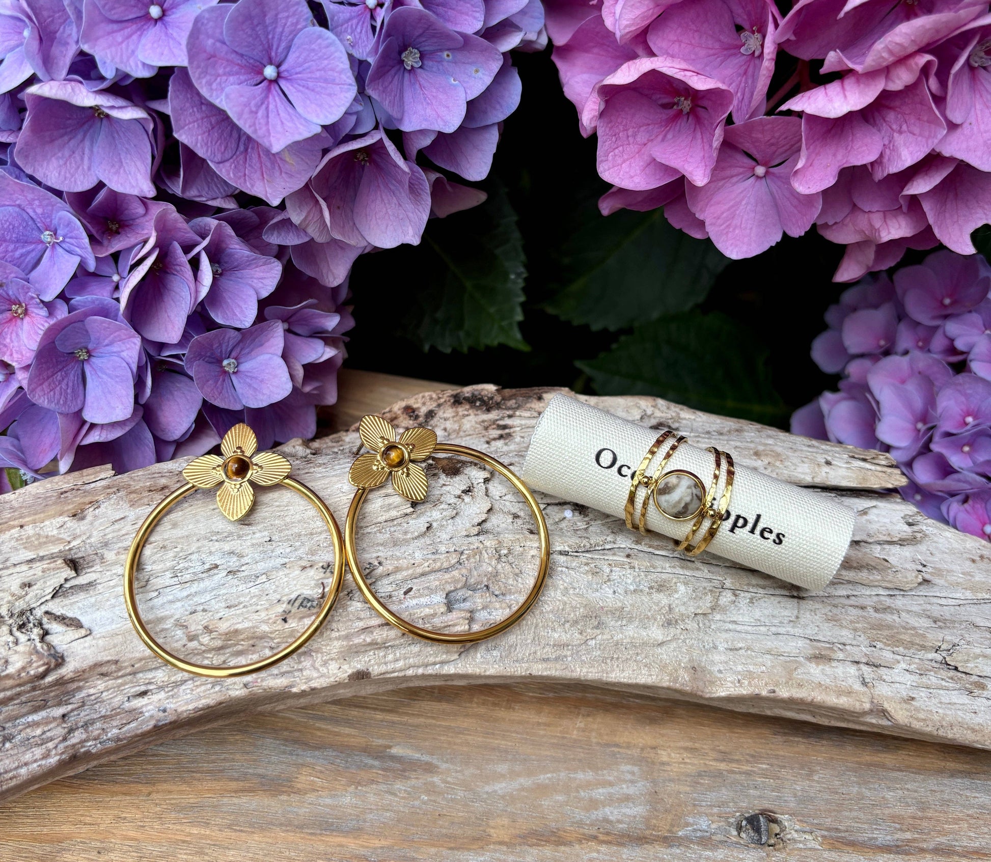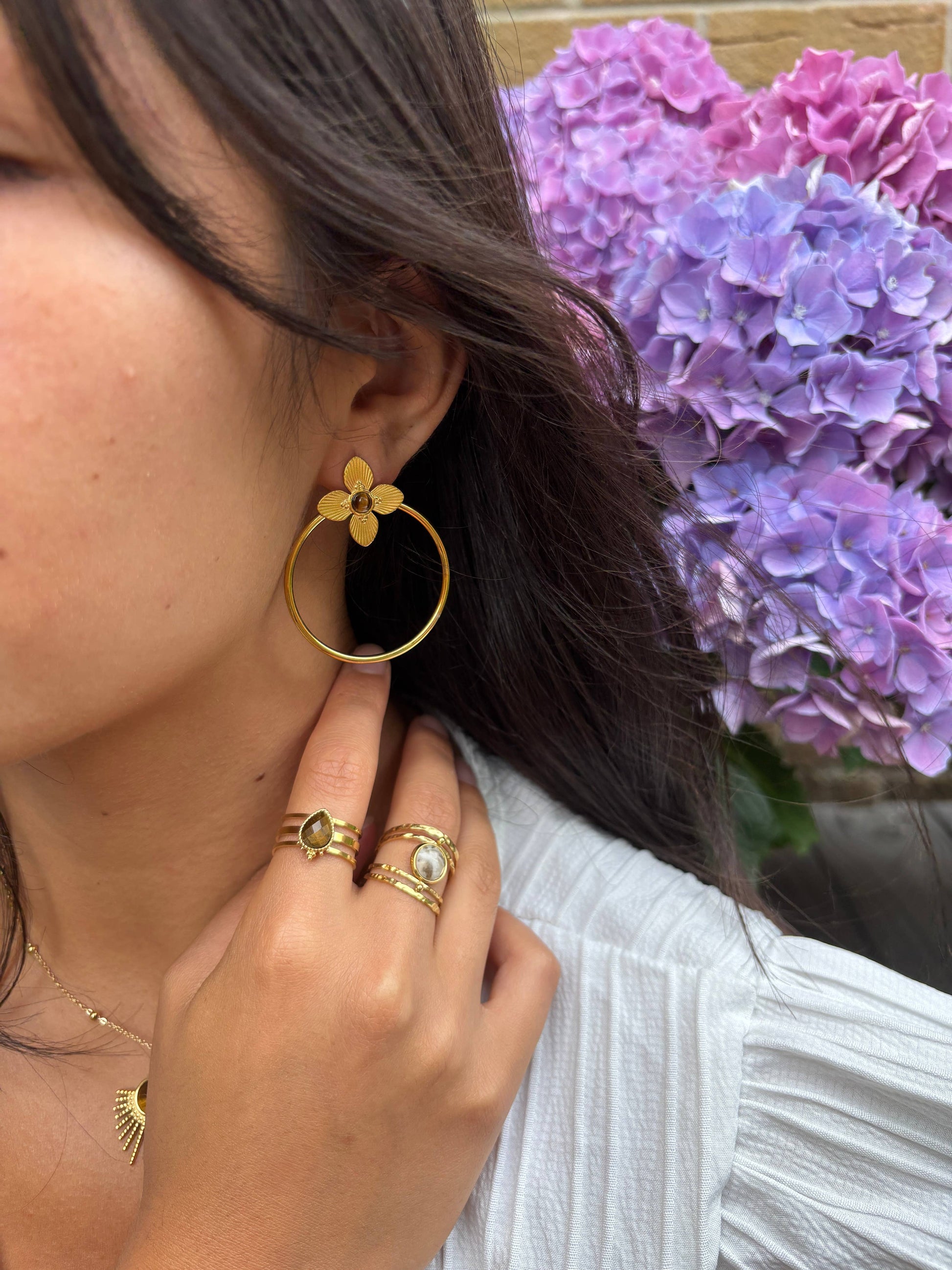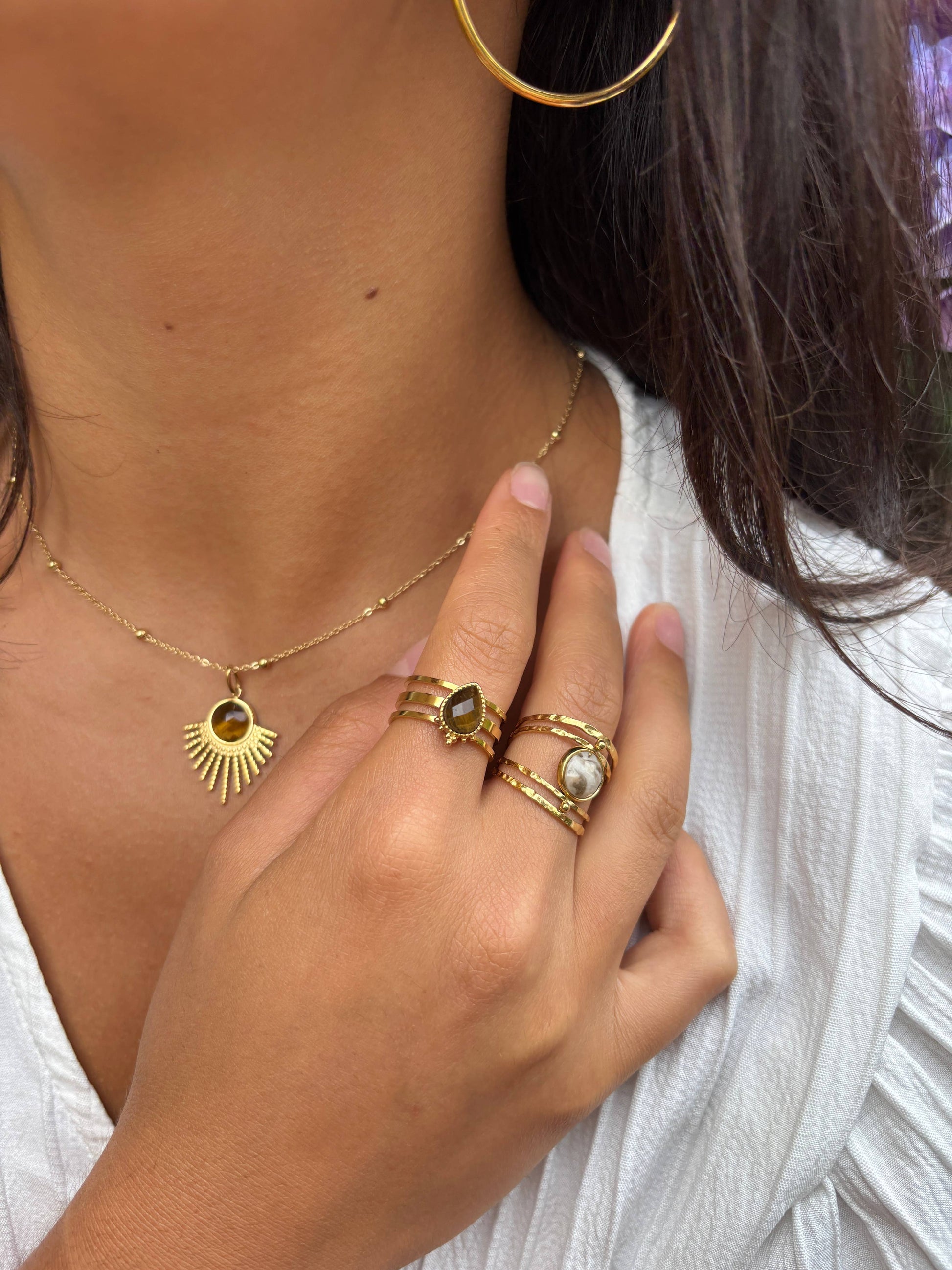 The open double band design adds a contemporary edge to the organic beauty of the stone.