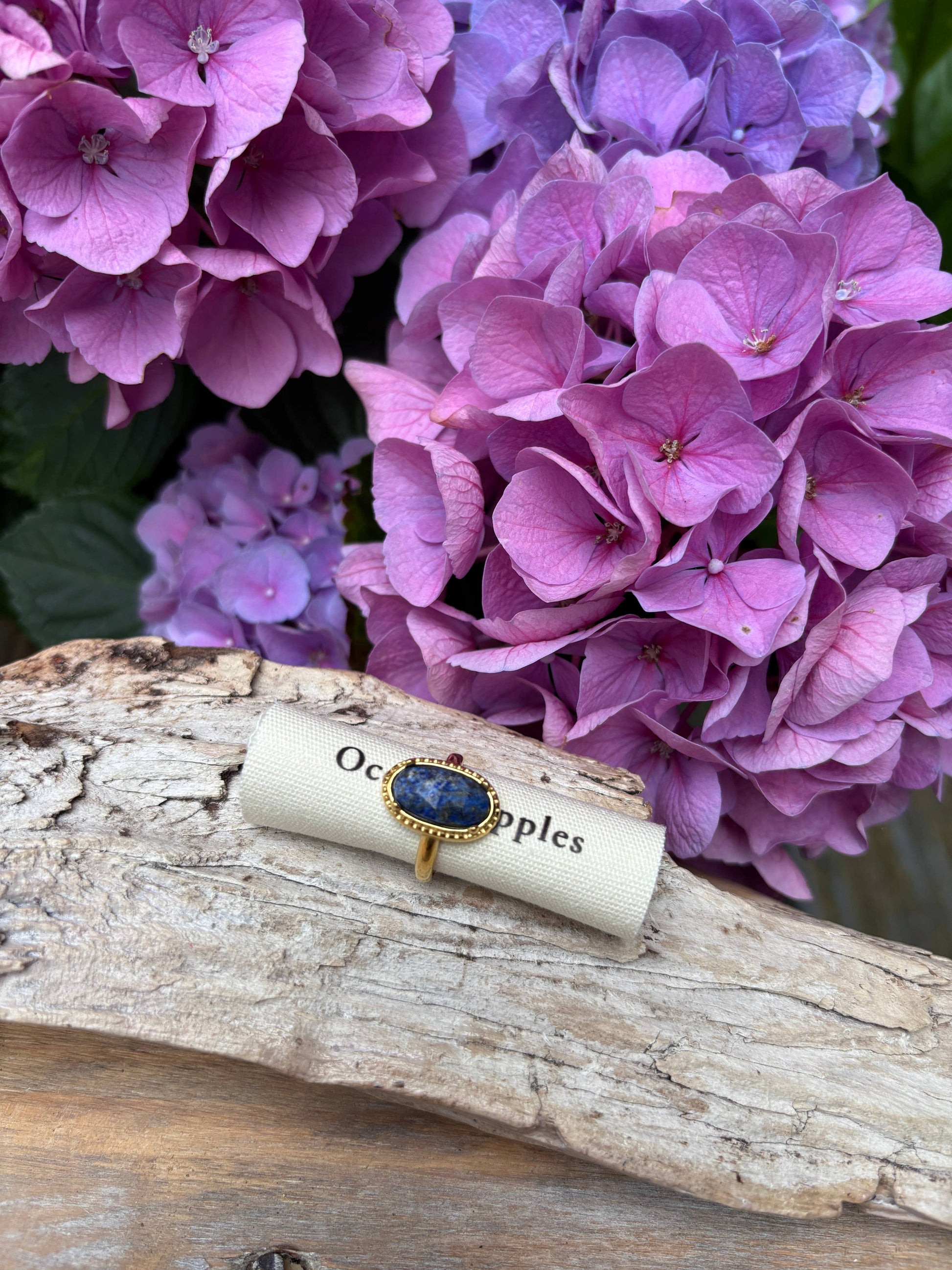 Simple yet elegant, this 18ct gold plated ring features a faceted lapis lazuli stone in an oval setting, framed by delicate beading and set on an adjustable band.
