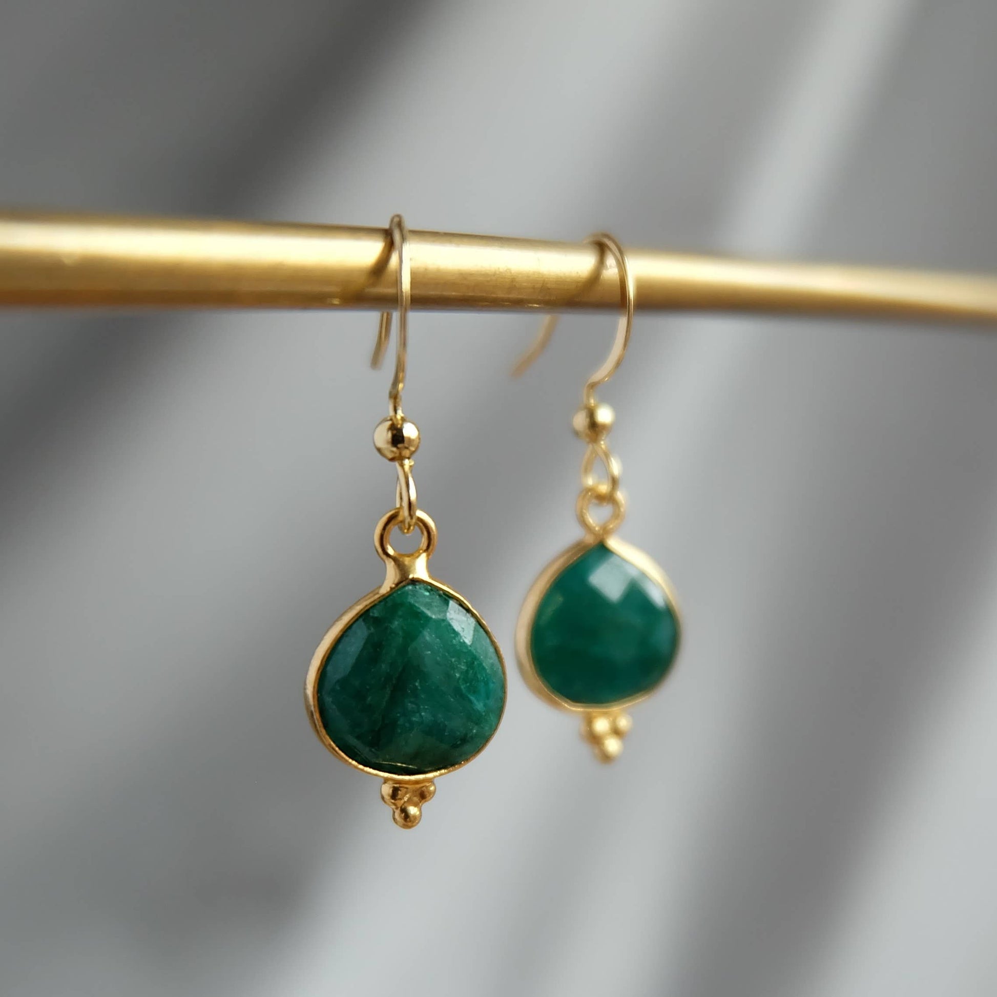 Natural emerald gemstones and gold stainless steel French ear wires.