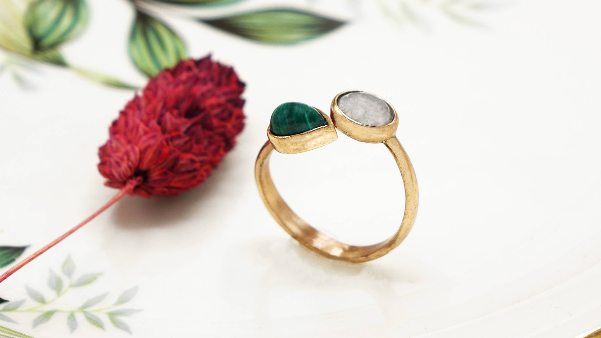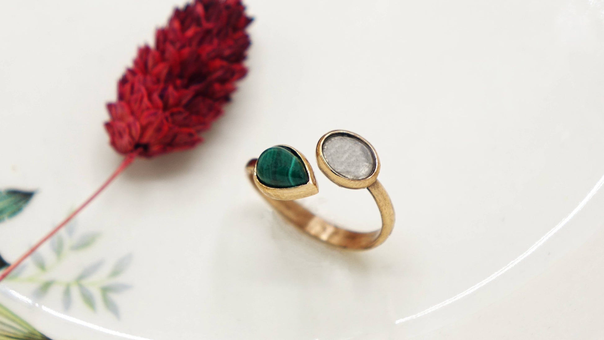 Malachite is known for its protective and transformative properties, while Moonstone is associated with intuition and emotional balance. Wearing this ring brings together these powerful energies, enhancing your inner strength and harmony.