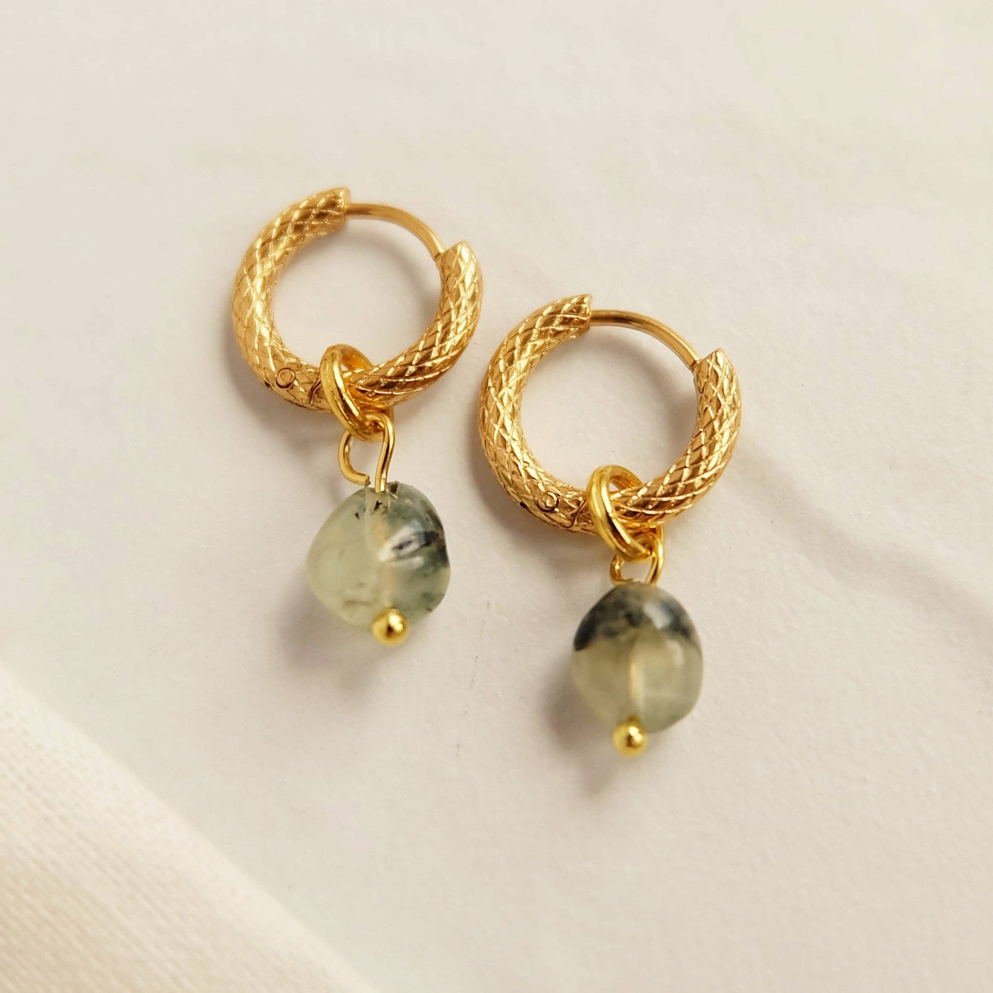 Unique 'snake skin' patterned gold hoops with green prehnite gemstone beads. Easy to fasten with leaver / clicker closure and super lightweight so they won’t weigh down your ears.