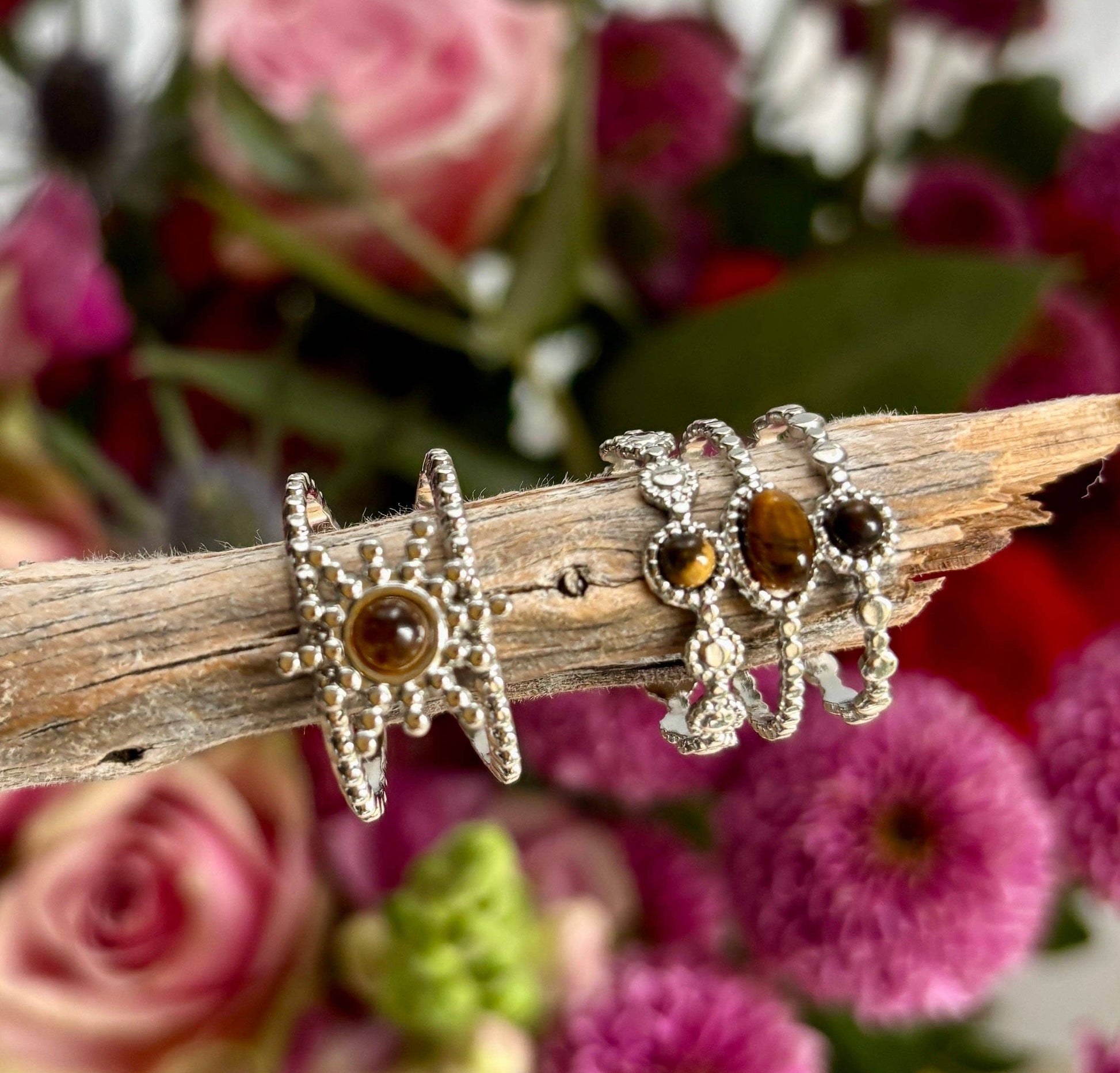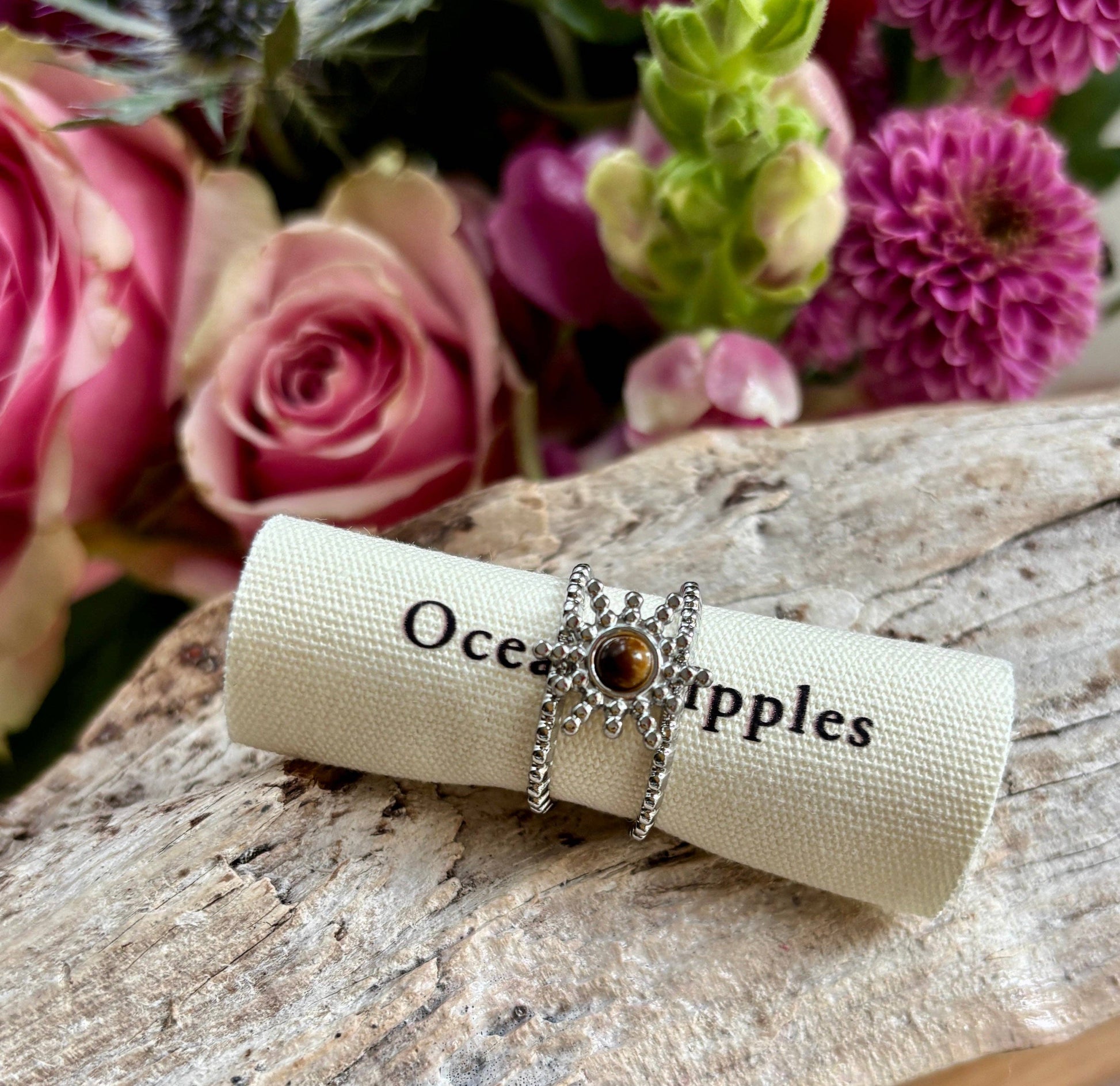 This silver beaded double band ring features a radiant star shaped frame holding your Tiger's Eye stone.