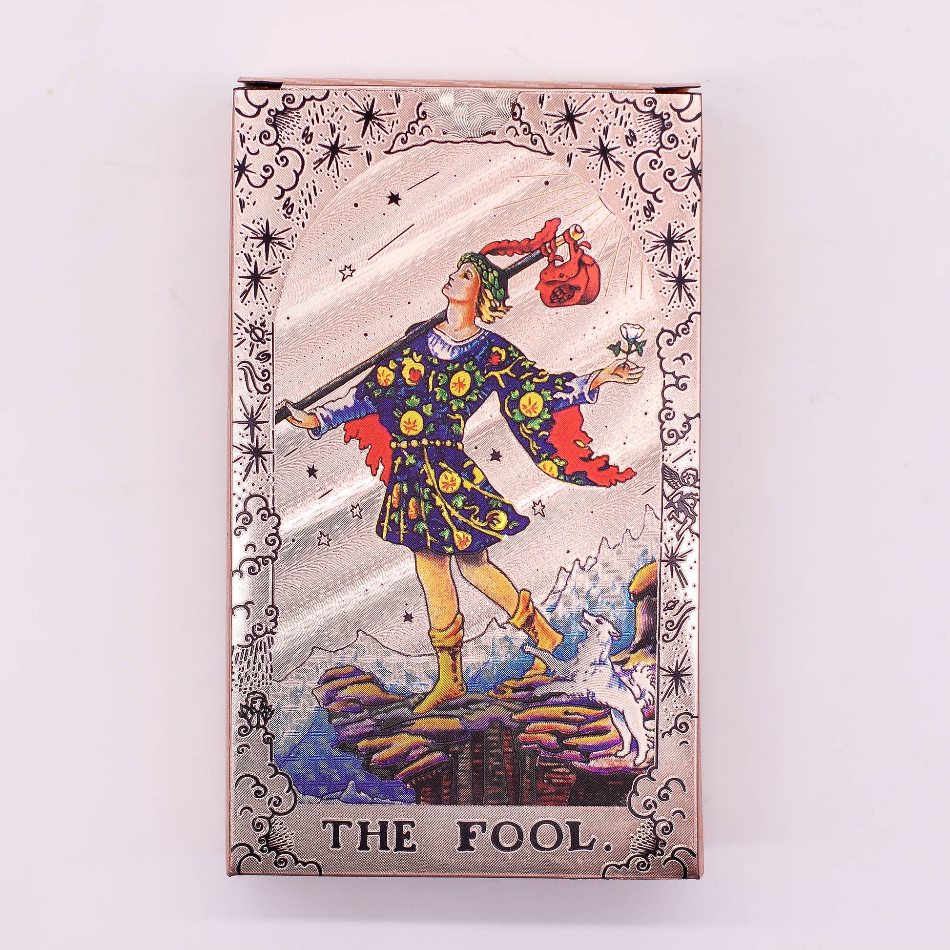 • 78-Card Deck – Complete set with classic tarot imagery enhanced by rose gold foil.