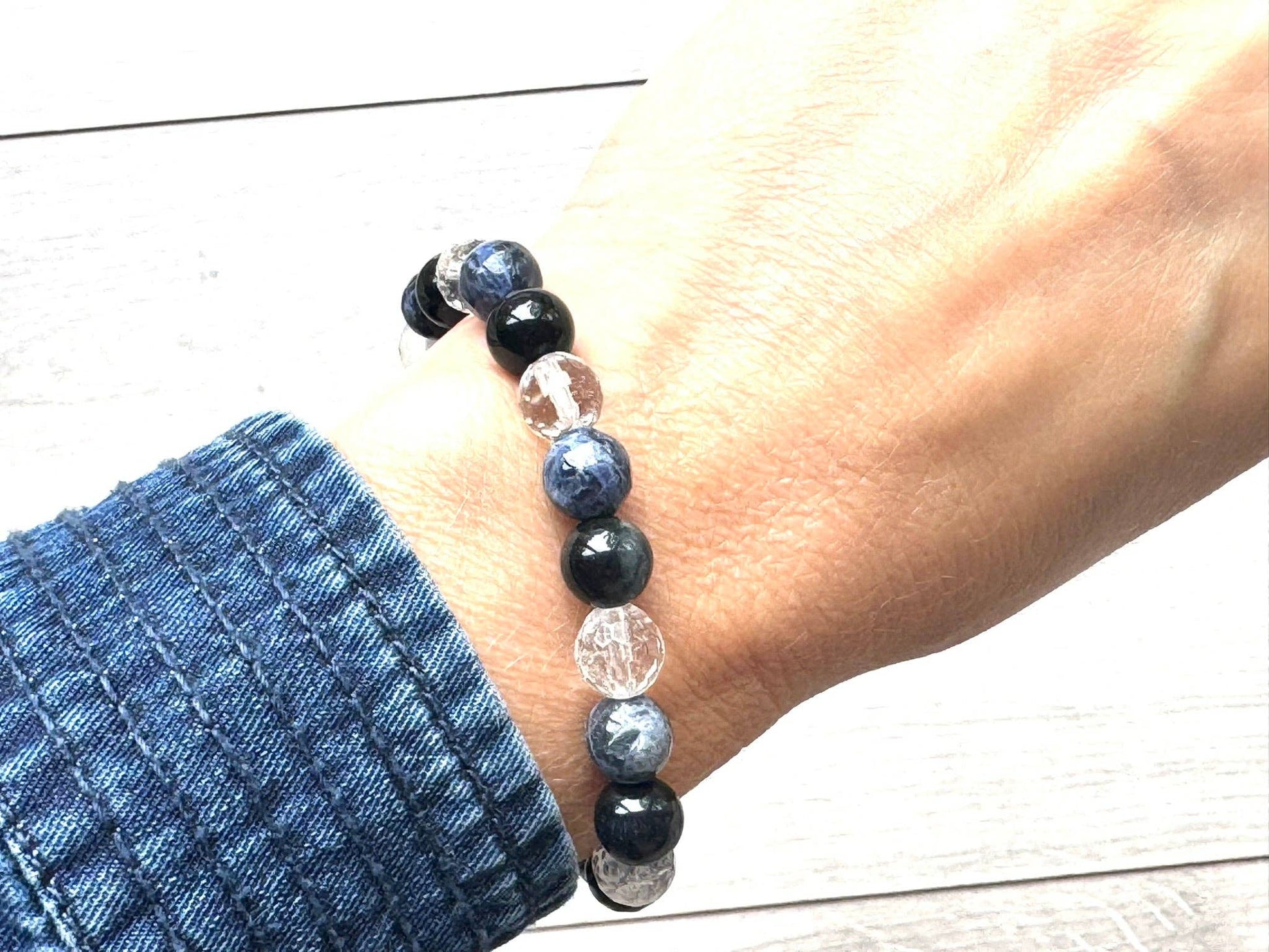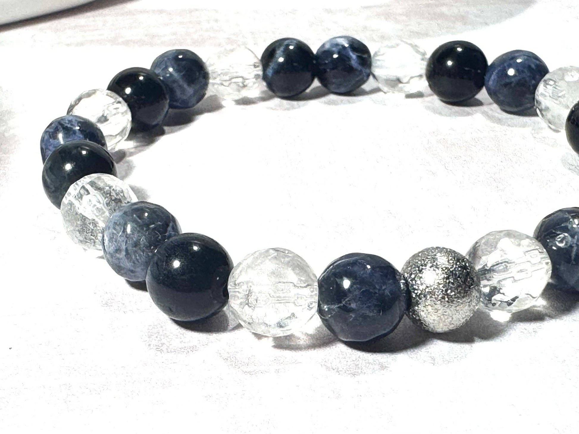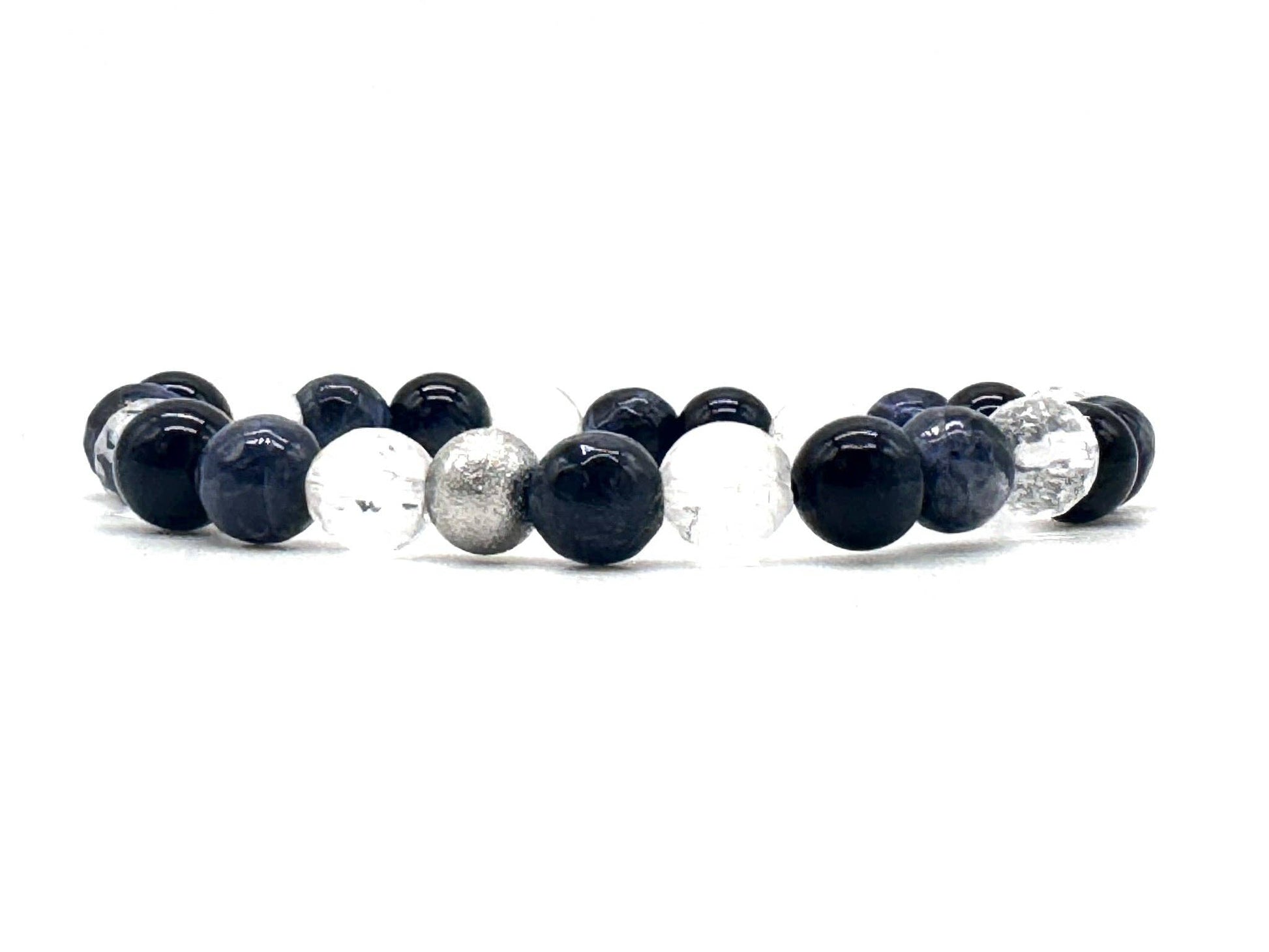 Grounded in meaning and crafted with care, this 8mm gemstone bracelet combines a stunning mix of faceted sodalite, deep navy tiger’s eye, and clear quartz beads, finished with a single textured stainless steel silver bead for a modern, polished look.